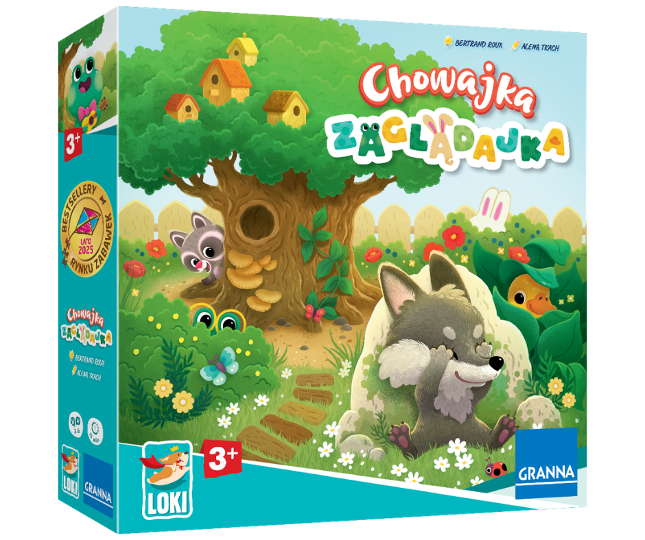 Chowajka Zaglądajka to pięknie ilustrowana gra nawiązująca do zabawy w chowanego, w której dzieci mają za zadanie chowanie swoich zwierzątek przed wzrokiem wilczka używając stojących na planszy elementów jako kryjówek. To kolejna propozycja przygotowana przez wydawnictwo Granna ze współpracą z francuskim wydawnictwem Loki, która doskonale łączy zabawę z rozwojem umiejętności przestrzennych.