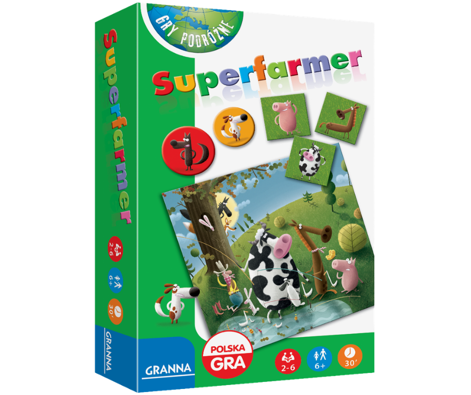 Oryginalne, jedyne w swoim rodzaju zasady gry autorstwa wybitnego polskiego matematyka – Karola Borsuka. Dopinguje do nauki sprawnego liczenia. Kto nie umie liczyć nie wygra w Superfarmera! Dodatkowo, gra rozwija umiejętności liczenia i spostrzegawczości. Idealna na wakacje, podróże i spotkania rodzinne – zabawa gwarantowana w każdym miejscu!