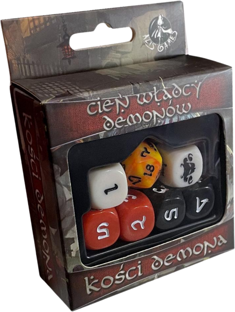 ZESTAW KOŚCI DEMONA to oficjalny pakiet 7 kości do gry RPG Cień Władcy Demonów. Zestaw zawiera specjalnie oznaczone kości k6 (czerwone, białe i czarne) odpowiadające mechanice Obrażeń, Łask i Zgub, oraz unikalną kość k20. Niezbędny dodatek dla graczy ceniących płynność rozgrywki i klimat. Wydanie polskie od Alis.Games.