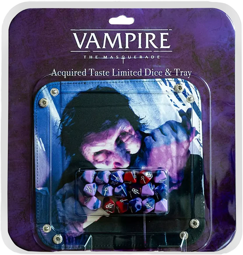 Limitowany zestaw kości do Wampir: Maskarada 5 Edycja. Zawiera 18 kości (w tym kości Głodu) i tackę. Oficjalny produkt World of Darkness. Premiera 01.2026!