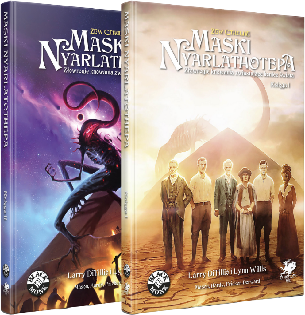Maski Nyarlathotepa to spektakularna, wieloczęściowa kampania do Zewu Cthulhu! Badacze Tajemnic wyruszą w pełną niebezpieczeństw podróż przez sześć różnych kontynentów, by poznać prawdziwe losy zaginionej ekspedycji Rogera Carlyle’a. Dwa pięknie ilustrowane tomy wypełnione są dodatkowymi przygodami, detalami historyczno-geograficznymi i bluźnierczym okultyzmem. Kampania pozwala na poprowadzenie opowieści w klimacie klasycznego śledztwa, jak również w pulpowej wersji pełnej niespodziewanych zwrotów akcji. Niezłomni Badacze rzucą wyzwanie sługom ciemności, a od wyniku ich działań będą zależeć losy całej ludzkości!