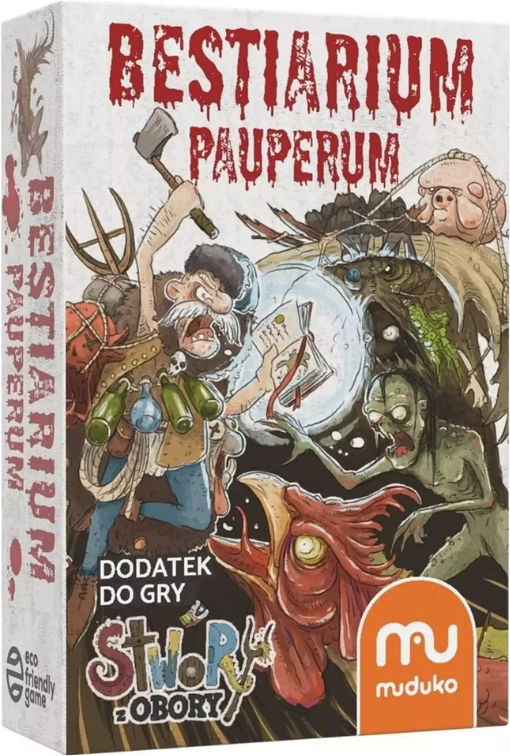 „Bestiarium Pauperum” to obowiązkowy dodatek dla każdego fana „Stworów z Obory”. Rozszerzenie wprowadza 30 nowych, plugawych potworów rodem ze słowiańskich legend (i zza hasioka), nowe postacie, wydarzenia oraz karty targowiska. Dzięki temu dodatkowi zwiększysz regrywalność podstawki i zaprosisz do stołu nawet 6 graczy! Przygotuj się na jeszcze więcej negatywnej interakcji i wiejskiego humoru.