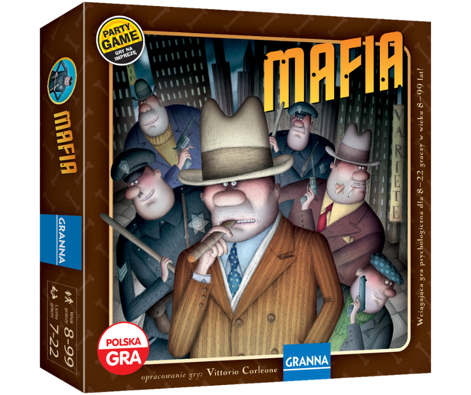Mafia to wciągająca gra imprezowa dla 7-22 graczy, która oparta jest na popularnej grze psychologicznej. W mieście Spytown toczy się nieustanna walka między mafiozami działającymi w tajemnicy a policjantami próbującymi ich złapać. Idealna na imprezy, wyjazdy integracyjne i spotkania towarzyskie.
